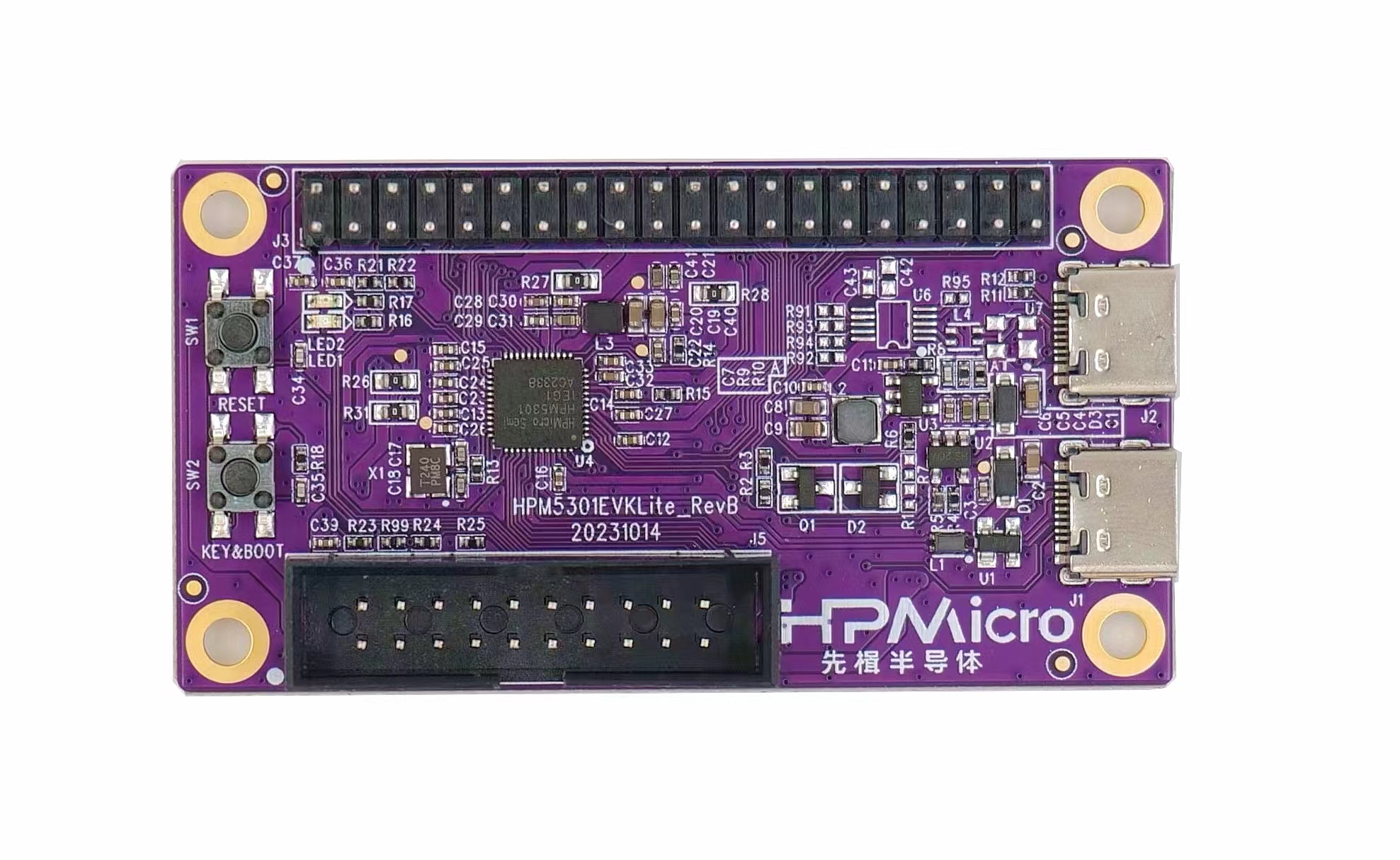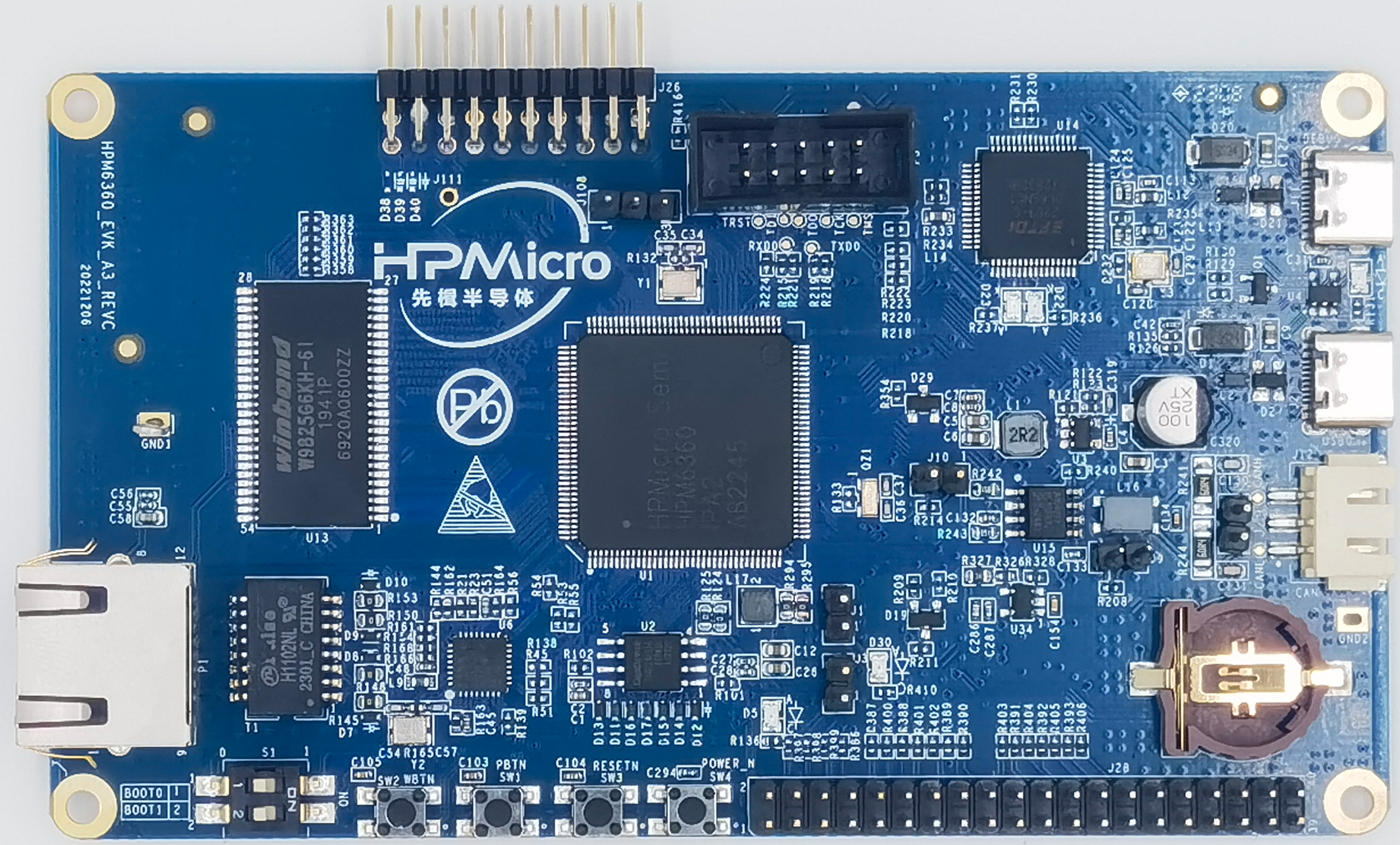 HPM6360EVK提供了HPM6360微控制器大部分外设的接口,包括1个SD卡槽,1个USB Type-C接口,一个百兆网口,CAN FD接口等,并扩展了NOR Flash,SDRAM等外接存储器,并集成了板载调试器。