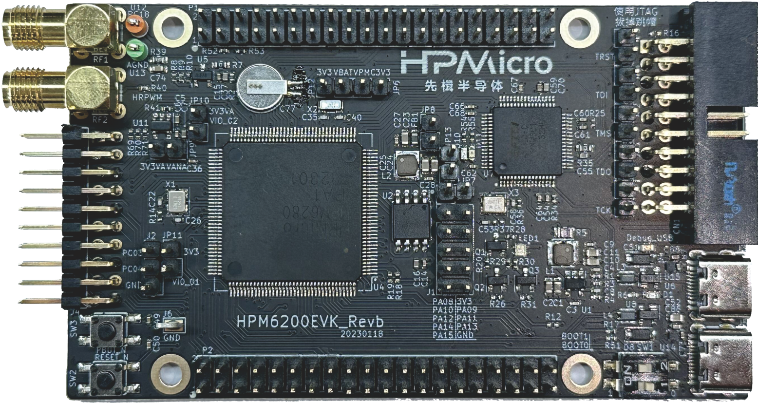 HPM6200EVK提供了一系列HPM6200系列微控制器特色外设的接口,包括一个ADC输入SMA接口,一个高分辨率PWM输出的SMA接口,和一个先楫标准的电机控制接口。HPM6200EVK同时集成了2个2x20 pin IO扩展接口,连接了HPM6200 MCU的大部分IO,供用户自由评估。HPM6200EVK为MCU外扩了NOR Flash存储,并集成了板载调试器。
