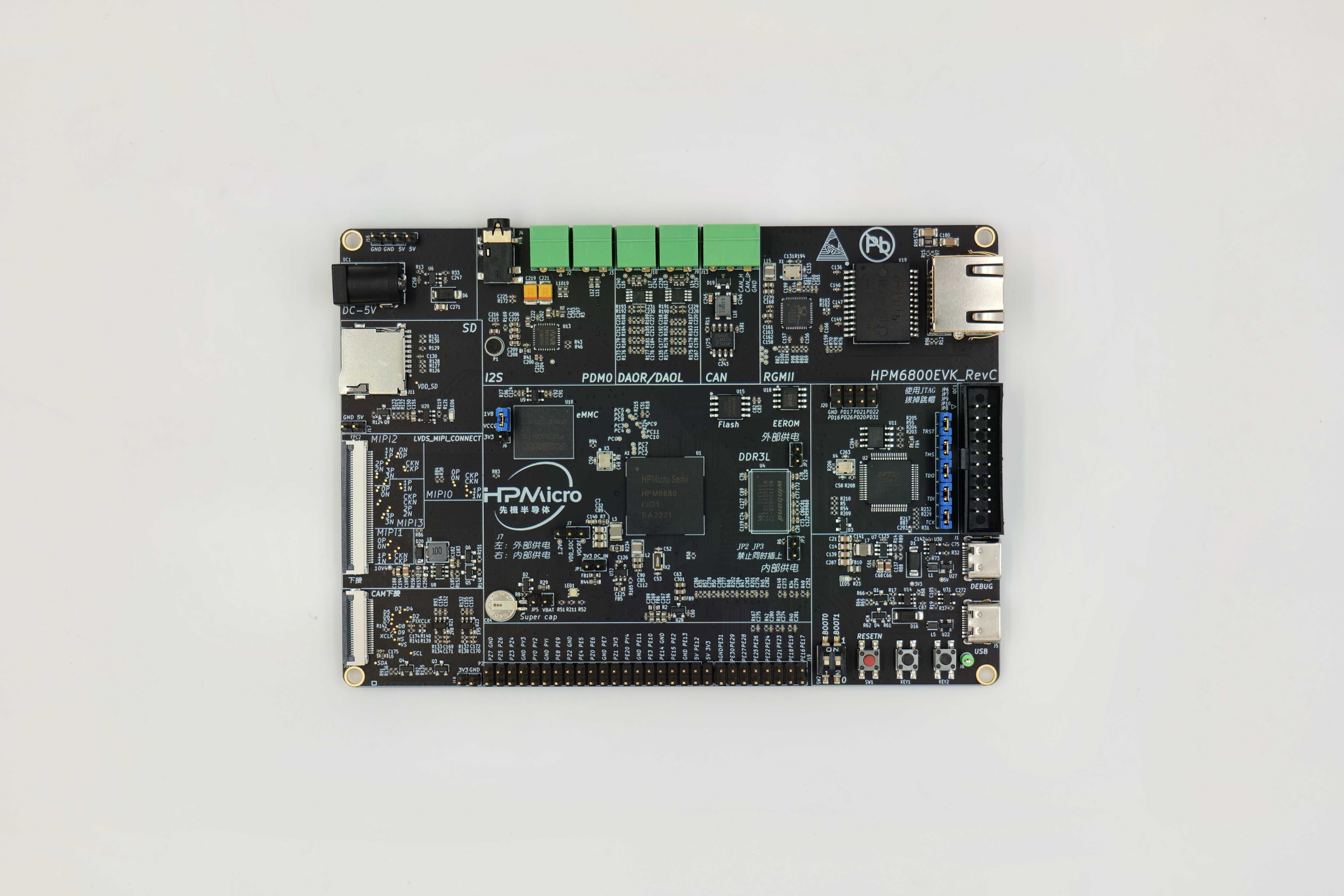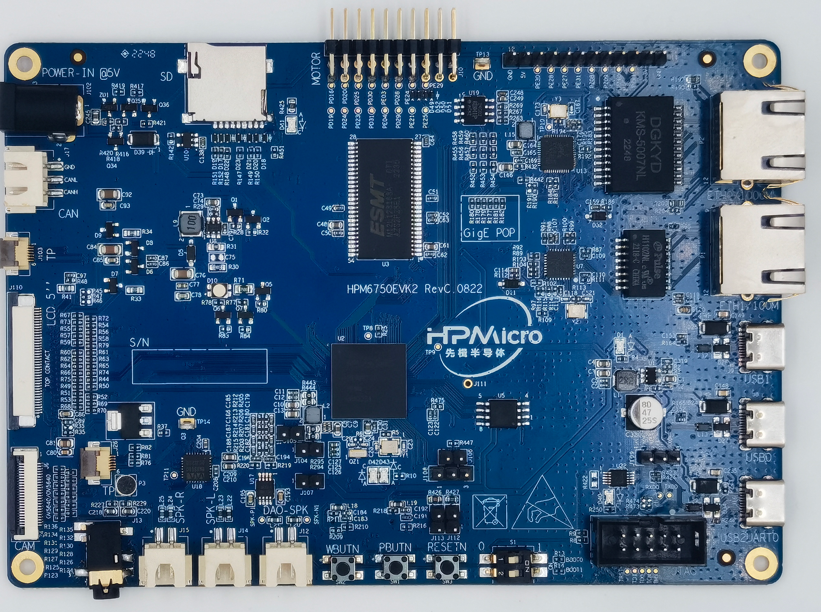 HPM6750EVK2提供了HPM6750微控制器大部分外设的接口,包括显示屏和摄像头接口,1个SD卡槽,2个USB Type-C接口,一个千兆网口、一个百兆网口,CAN FD接口,音频接口等,并扩展了NOR Flash,SDRAM等外接存储器。
