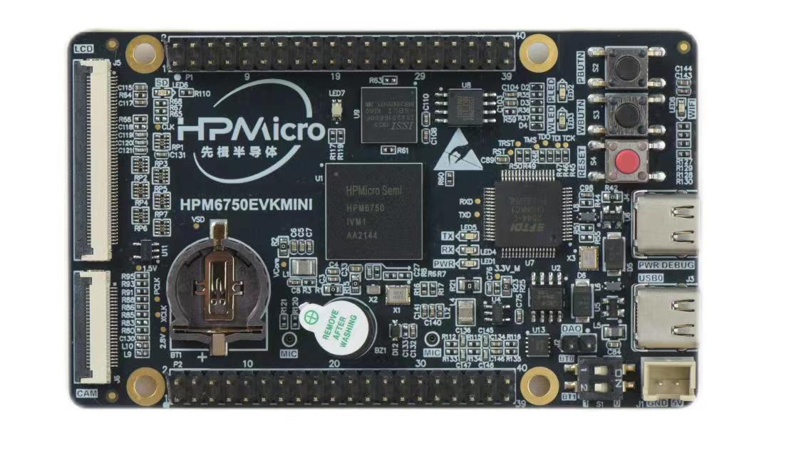 HPM6750EVKMINI提供了HPM6750微控制器典型外设的接口,包括显示屏和摄像头接口,1个SD卡槽,1个USB Type-C接口并集成了板载调试器,还兼容ART-PI扩展接口。