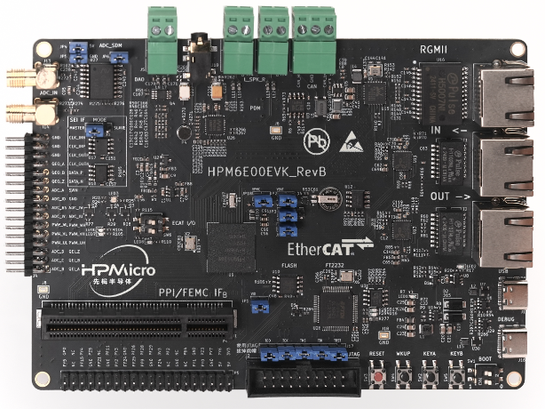HPM6E00EVK提供双百兆网口,实现ESC功能,RGMII千兆网口,CAN接口,音频接口,sigma-detal 转换接口,HS USB接口以及标准的电机接口可以适配先楫的电机驱动板。同时HPM6E00EVK的FEMC/PPI插槽,方便用户实现各类总线接口,并默认提供FEMC/PPI子板,可以实现SDRAM和并口的ADC采样功能。此外,还提供树莓派接口以及板载的调试接口可以方便用户进行调试,同时也提供标准的JTAG接口供用户选择。